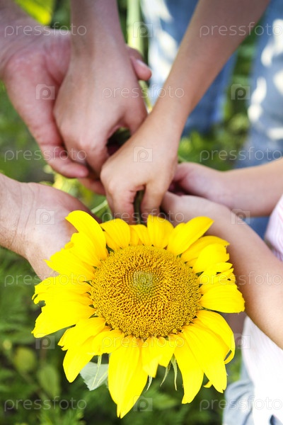 Семья держит подсолнух в саду