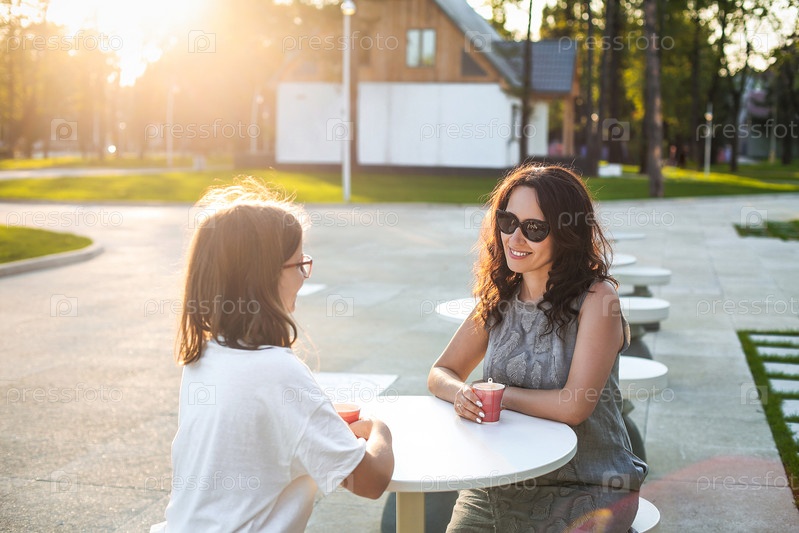 Мать и дочь пьют кофе вечером