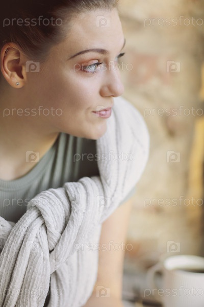 Крупным планом портрет молодой брюнетки, смотрящей в окно с неподдельным интересом
