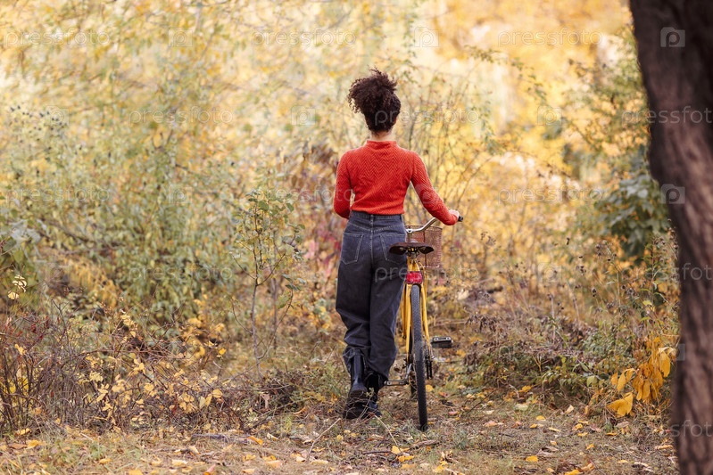 Активность выходного дня в осенний сезон. Молодая счастливая улыбающаяся женщина смешанной расы с велосипедом в осеннем лесу. Вид сзади на позитивную активную африканскую американку в повседневной одежде, катающуюся на городском велосипеде на природе