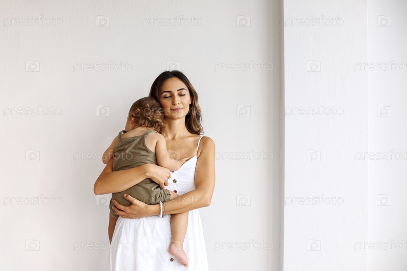 Портрет материнства. Молодая красивая любящая мать в белом платье держит милого мальчика, стоя в изоляции над белой стеной