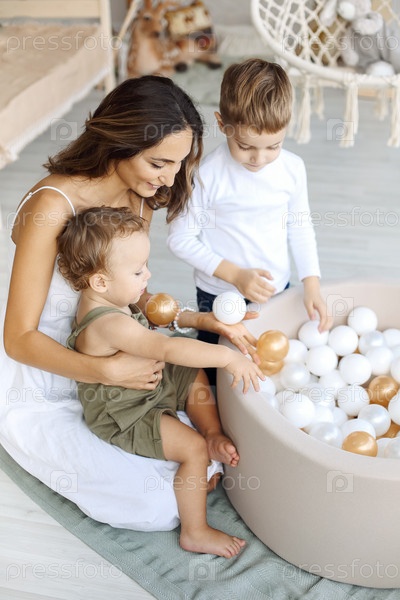 Молодая любящая мать с двумя детьми дошкольного возраста и малышом, сидящим рядом с пенным круглым бассейном для игры в мяч в комнате
