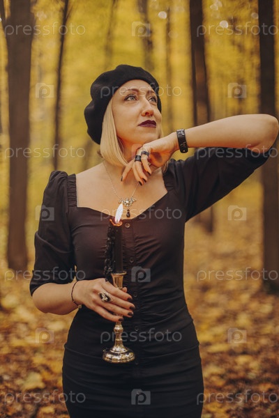 Таинственная женщина в черном платье держит в руке свечу на подсвечнике