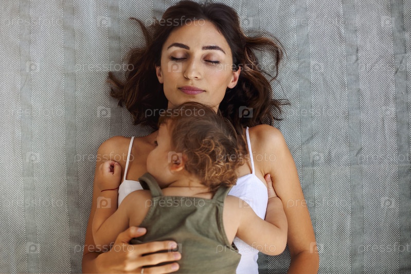 Молодая мать с милым мальчиком на груди спит вместе дома