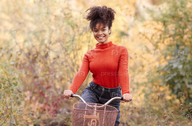 Молодая счастливая улыбающаяся африканская американка на велосипеде в осеннем лесу