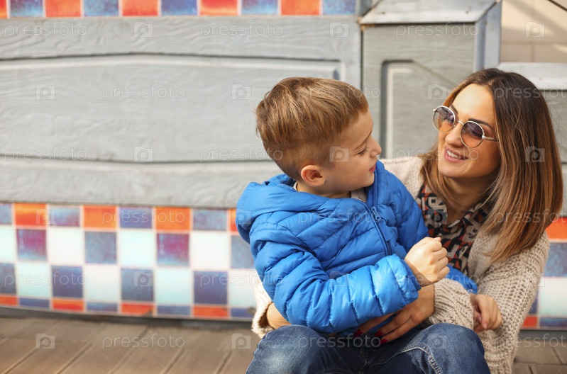 Молодая счастливая семья, мать и маленький сын, проводят время вместе на открытом воздухе