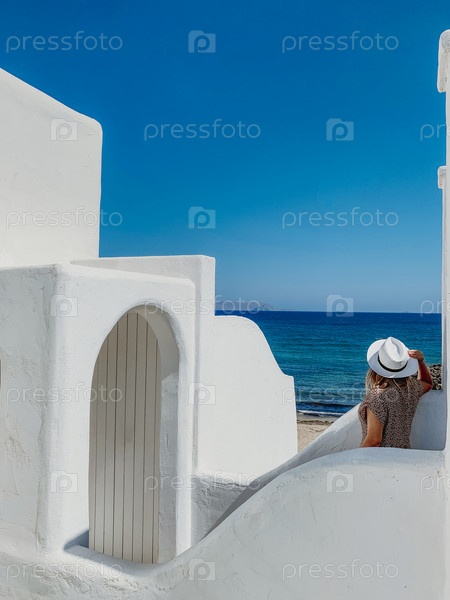 Счастливая блондинка в соломенной шляпе, стоящая на белой террасе курортного отеля
