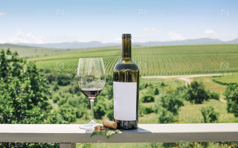 Бутылка красного вина, виноградная лоза, стекло и пробка