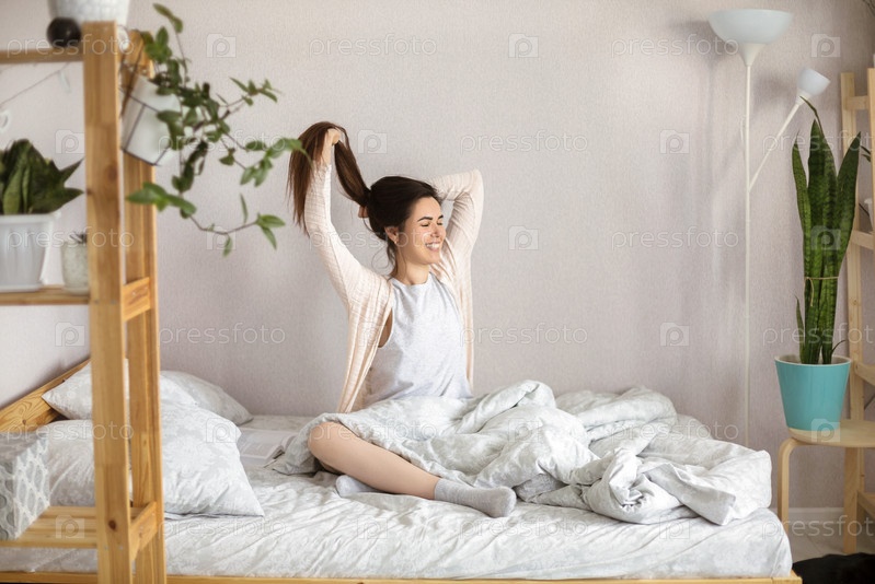 Молодая счастливая расслабленная женщина в пижаме сидит на кровати с закрытыми глазами в утреннее время дома