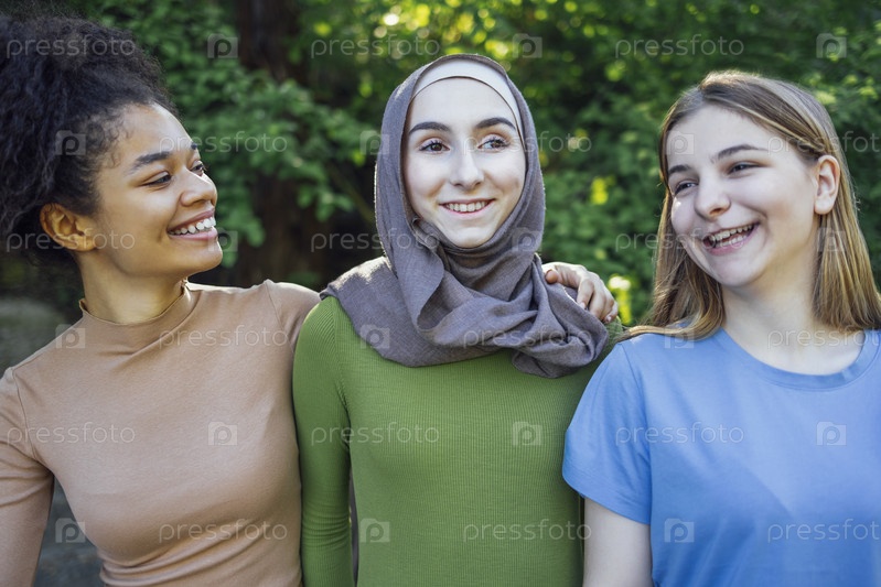 Многорасовые молодые подруги-подростки гуляют в парке и смеются