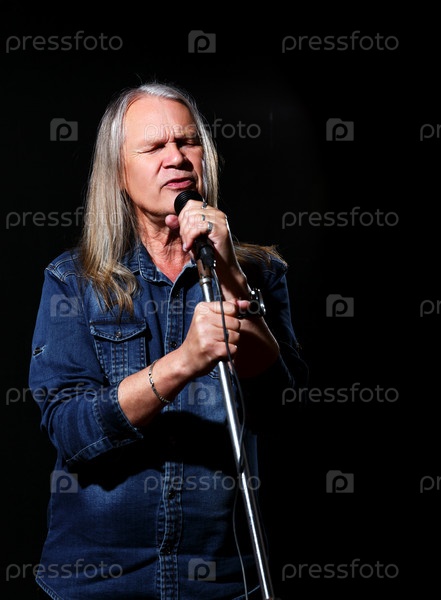 Пожилой мужчина с длинными седыми волосами в синей джинсовой рубашке поет в микрофон на сцене на черном фоне