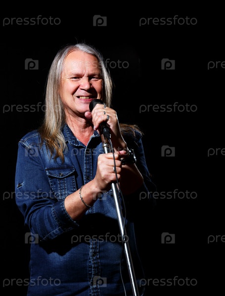 Пожилой мужчина с длинными седыми волосами в синей джинсовой рубашке поет в микрофон на сцене на черном фоне