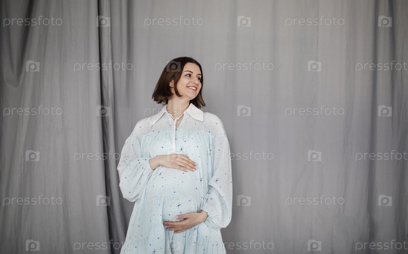 Привлекательная беременная женщина в голубом платье на сером фоне