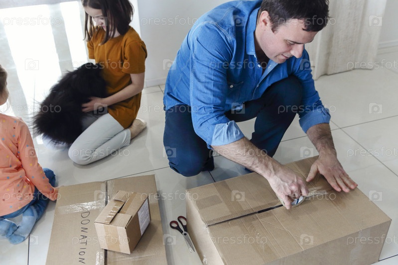 Дети помогают отцу упаковывать картонные коробки для переезда