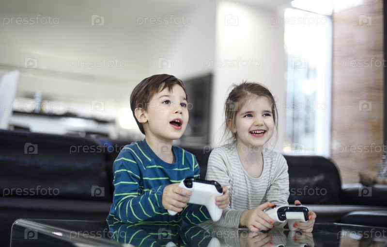 Радостные дети с игровыми контроллерами играют дома в видеоигры