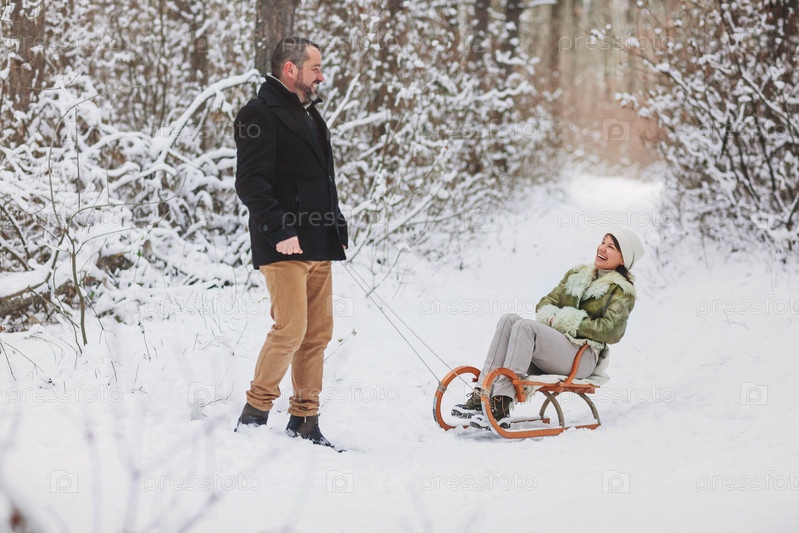 Счастливая игривая зрелая семейная пара катается на санках в зимнем парке, смеется и веселится вместе