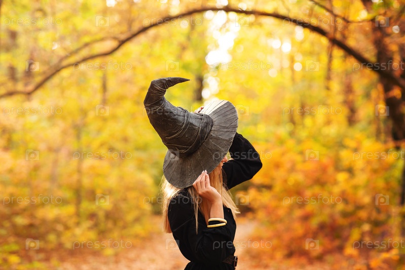 Молодая ведьма гуляет в осеннем лесу