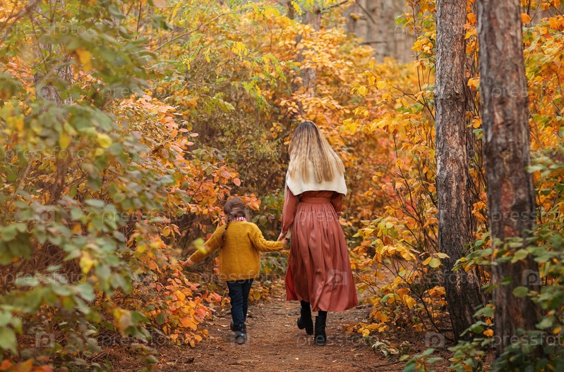 Вид сзади или молодая семья, мать и маленькая дочь, на прогулке в осеннем лесу, мама и ребенок держатся за руки и идут по тропинке, покрытой желтыми листьями дерева