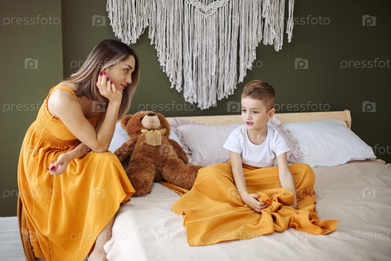 Сказка на ночь. Любящая мать укладывает сына спать на дневной сон, мама сидит рядом со своим ребенком, лежащим с игрушкой плюшевого мишки в постели дома