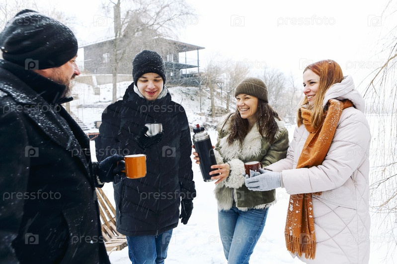 Люди на зимнем курорте на зимних каникулах. Друзья отдыхают, пьют горячий кофе
