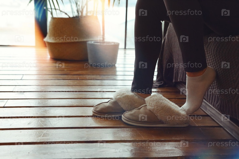 Женщина надевает мягкие плюшевые теплые тапочки, сидя на диване в уютном доме в холодное время года