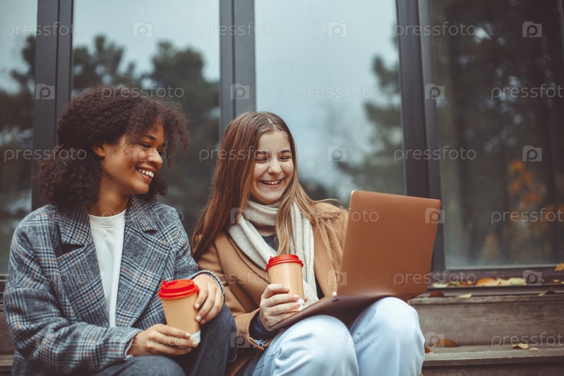 Две счастливые многорасовые девочки-подростки смотрят на ноутбук и смеются, попивая кофе в осеннем парке