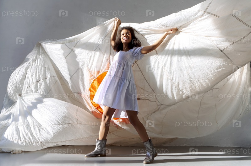 Прыгай и лети. Молодая счастливая беззаботная афроамериканка прыгает в воздух с большой белой тканью