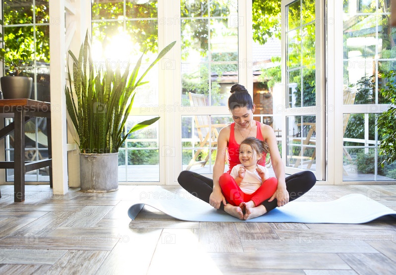 Молодая брюнетка с маленькой дочерью в спортивной форме занимается йогой