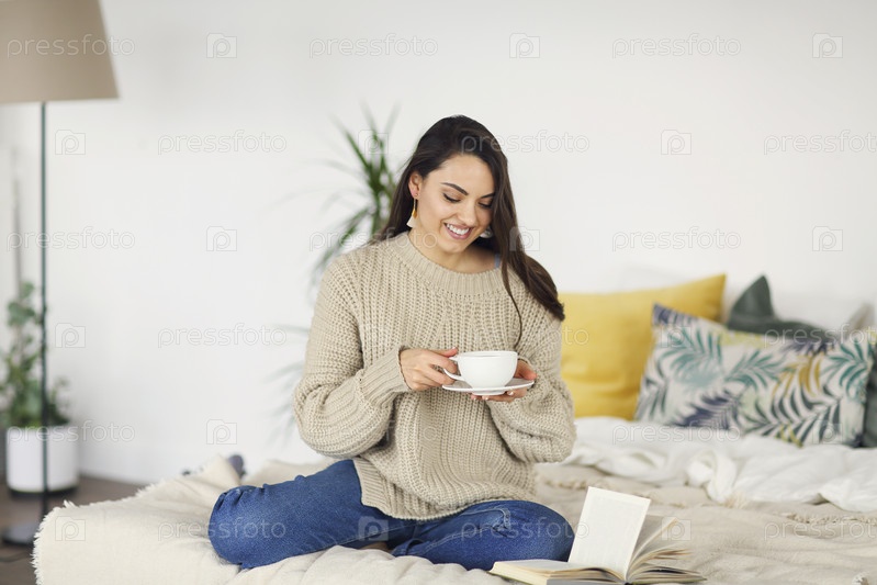 Молодая счастливая брюнетка с книгой в свитере
