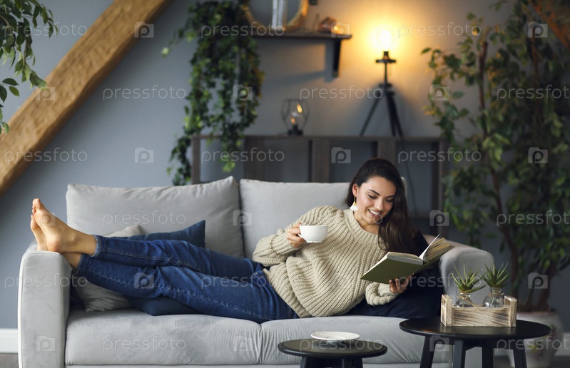 Молодая счастливая брюнетка с книгой в свитере