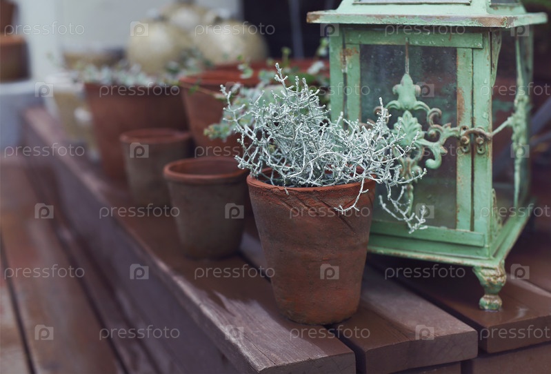 Комнатные растения в горшках и старинный фонарь в саду на деревянном столе