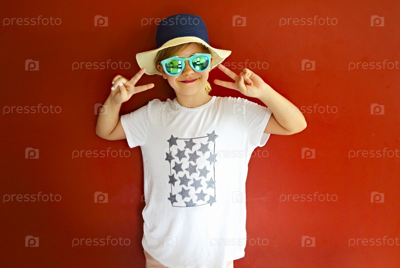 Довольно эмоциональный ребенок носит шляпу и солнцезащитные очки на красном фоне