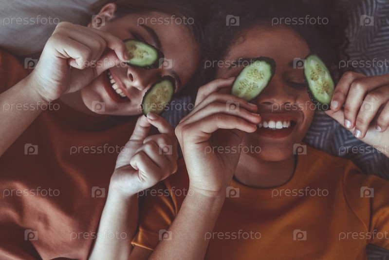 Две лучшие подруги проводят время вместе, развлекаясь, прикладывая ломтики огурца к глазам