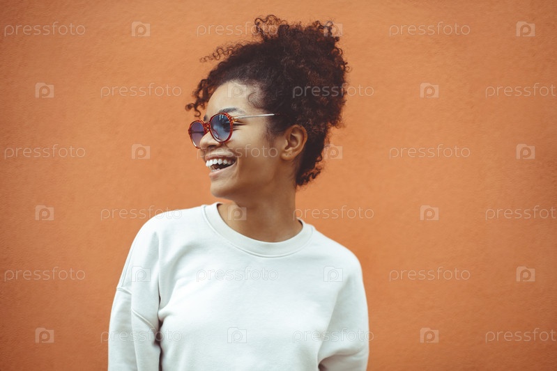 Молодая женщина африканского происхождения в стильных солнцезащитных очках смеется, стоя на улице