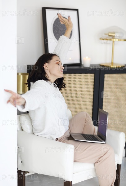 Расслабленная позитивная девушка сидит дома в кресле с ноутбуком на коленях