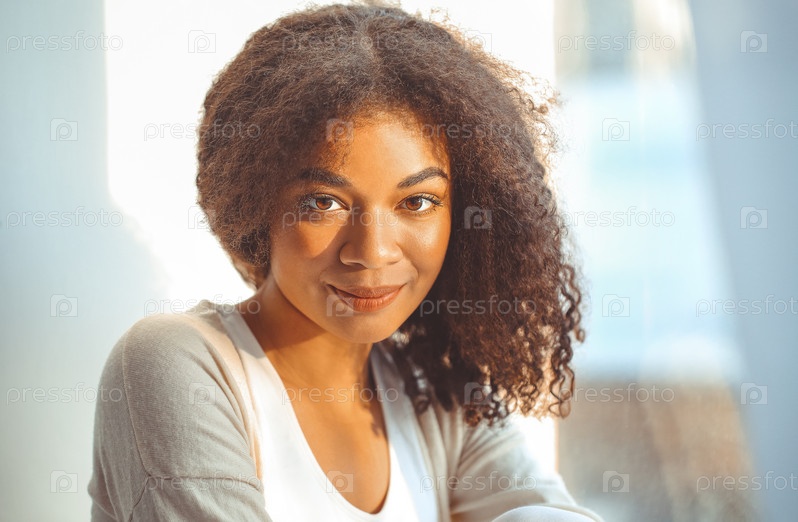 Счастливая расслабленная афроамериканка с закрытыми глазами сидит дома на подоконнике