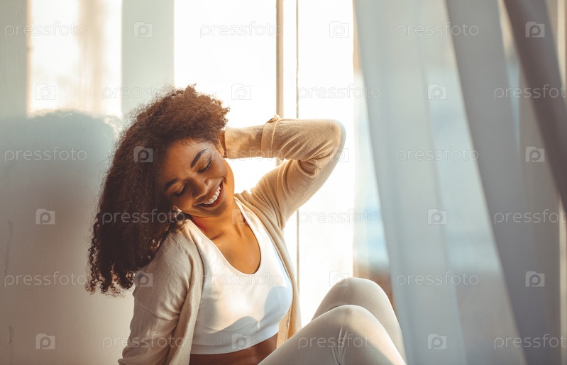 Счастливая расслабленная афроамериканка с закрытыми глазами сидит дома на подоконнике