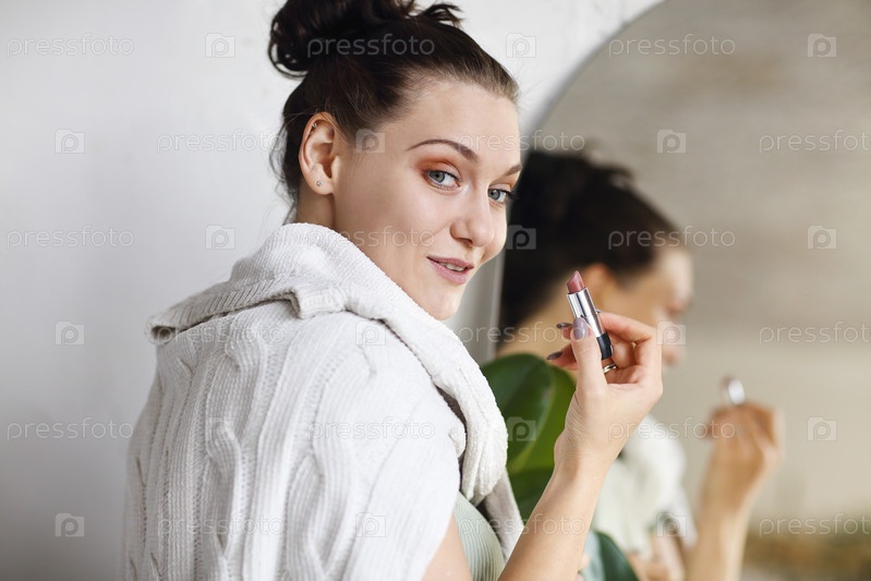 Фотография смешной смеющейся молодой девушки, наносящей помаду на губы, смотрящей на свое отражение в настенном зеркале дома, широко улыбающейся, весело проводящей ежедневный макияж, наслаждающейся процессом ухода за красотой