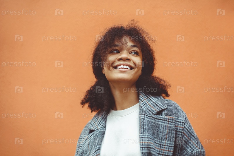 Счастливая девушка африканского происхождения с темной кудрявой прической в стильном пальто смотрит в сторону и улыбается