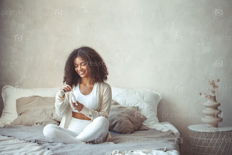 Обрезанное фото молодой модели смешанной расы, держащей бутылку с увлажняющей эссенцией
