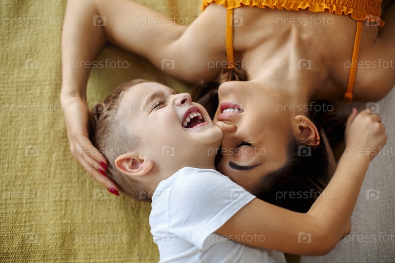 Вид сверху на молодую позитивную семейную мать и сына, смеющихся, наслаждающихся счастливыми моментами вместе