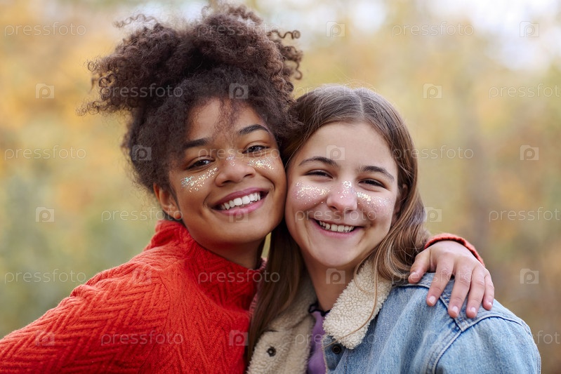 Две счастливые многорасовые подруги улыбаются в камеру и обнимаются, стоя в осеннем лесу