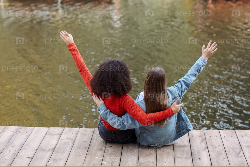 Две счастливые подруги сидят у реки и поднимают руки вверх, проводя время на осенней природе