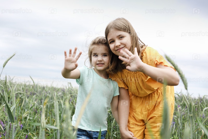 Две маленькие девочки обнимают друг друга на летнем поле