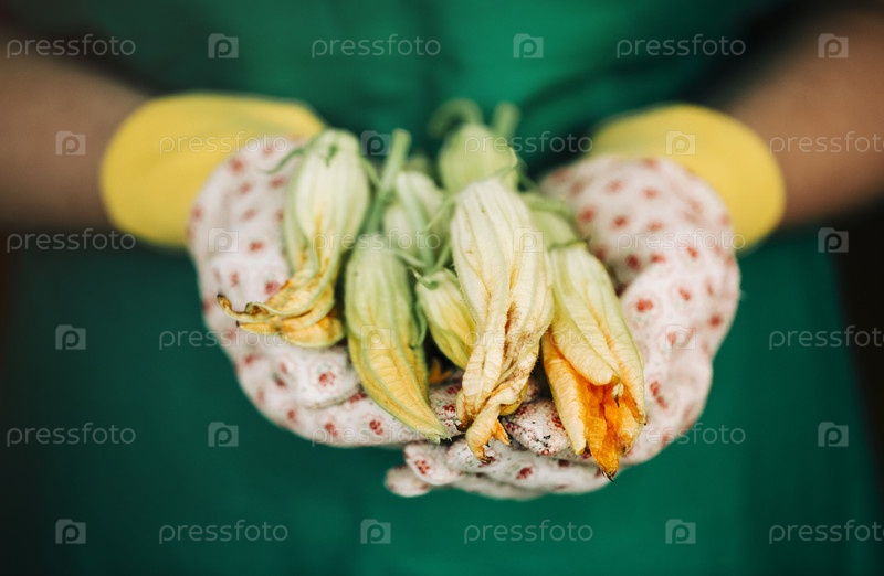 Цветы кабачков в руках садовника на открытом воздухе