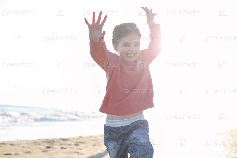 Милая улыбающаяся маленькая девочка, бегущая по солнечному пляжу, счастливая маленькая девочка