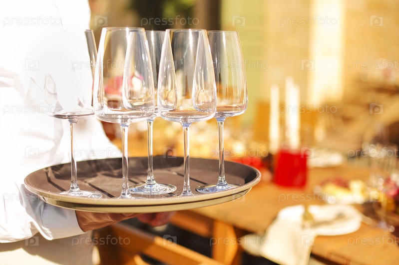 Официант несет поднос с пустыми бокалами во время работы в ресторане на открытом воздухе