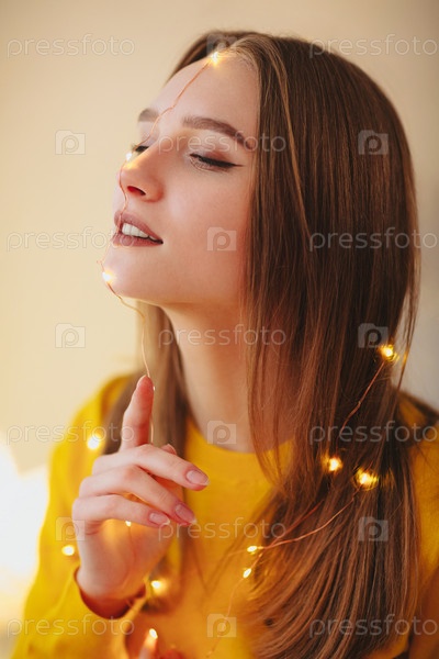 Молодая красивая брюнетка с закрытыми глазами и улыбкой на лице позирует со светодиодными огнями в волосах