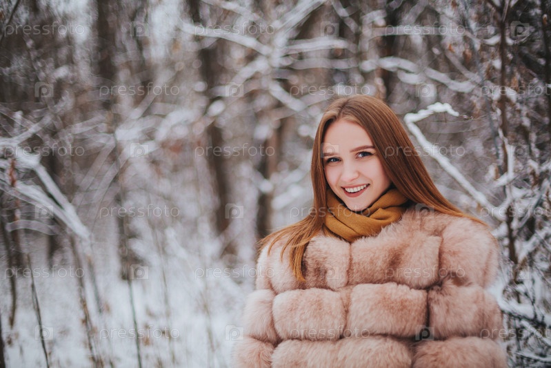 Привлекательная молодая брюнетка в шубе с шарфом, стоящая одна перед заснеженным лесом
