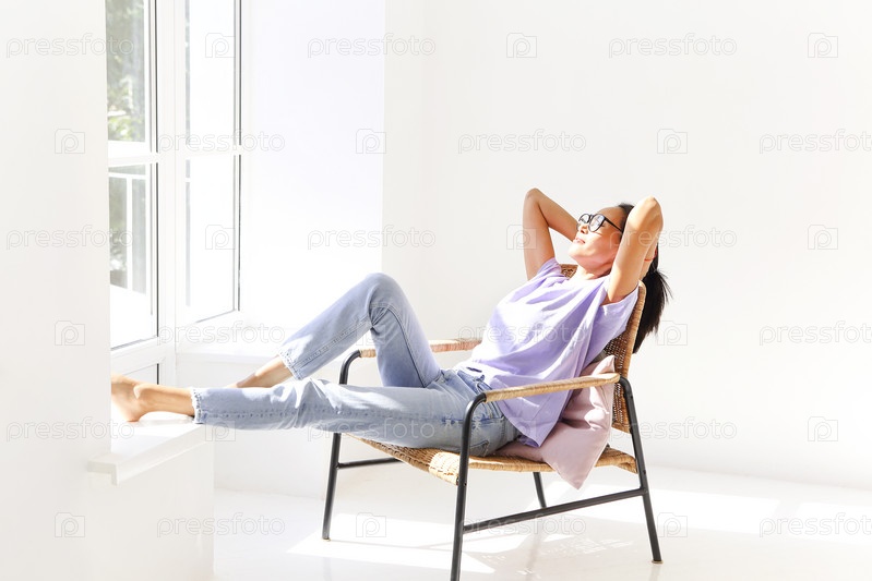Молодая расслабленная азиатка с закрытыми глазами лежит на стуле в белой пустой комнате перед окном